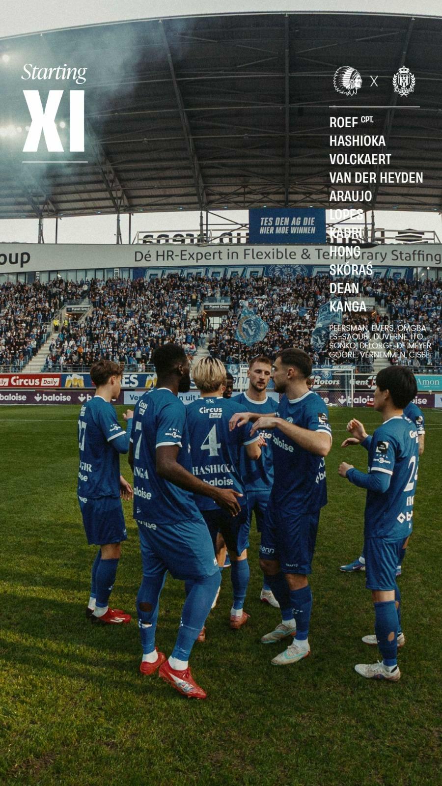 De opstelling van KAA Gent, u aangeboden door Canon: Roef, Hashioka, Volckaert, Van der Heyden, Araujo, Lopes, Kadri, Hong, Skóraś, Dean, Kanga.
